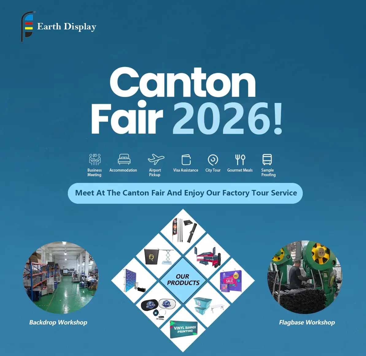 Pameran Kanton 2026 bakal teka, lan kita ing Earth Display ngarep-arep bisa ketemu sampeyan ing kana. Kita wis nggawe gendera wulu, latar mburi pop-up, dhasar gendera, spanduk vinyl khusus - umume apa wae kanggo pameran lan iklan - luwih saka sepuluh taun saiki. Wektu iki, tinimbang mung ngomong online, kita pengin nuduhake apa sing kita lakoni, adhep-adhepan.